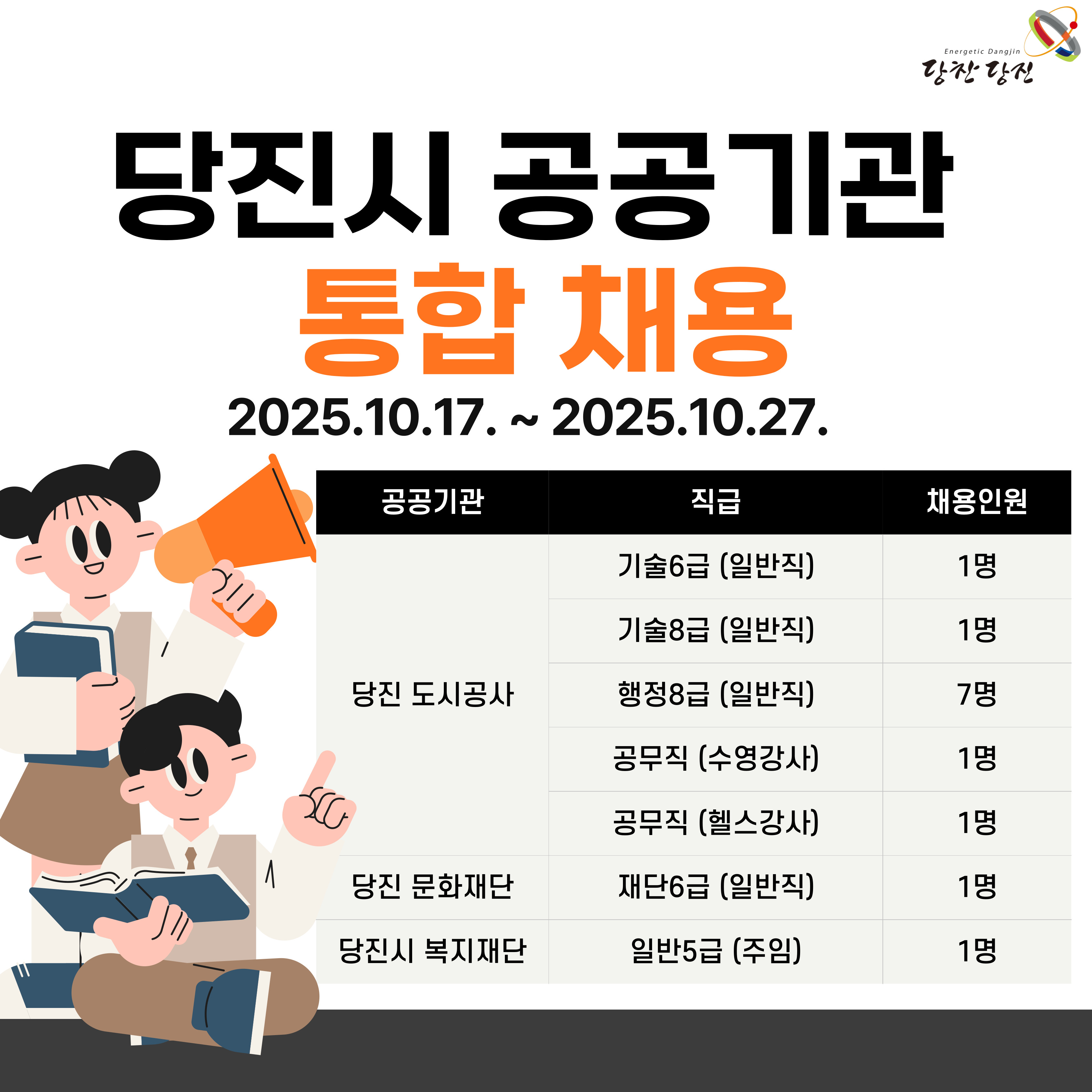 2025년 제 4차 (재)당진문화재단 직원 경력경쟁 채용 공고 | 서류접수예정 | 2025년 제 2차 당진시복지재단 직원 공개 채용 공고 | 서류접수예정 | 2025년 당진도시공사 공무직 공개 채용 공고 | 서류접수예정 |
